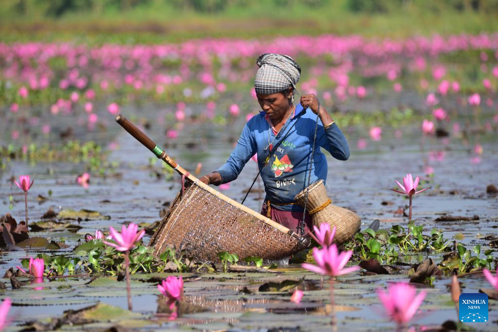 A woman catches fish amid blooming water lily flowers in a lake at a village in Morigaon district of India's northeastern state of Assam, Nov. 6, 2022. (Str/Xinhua)