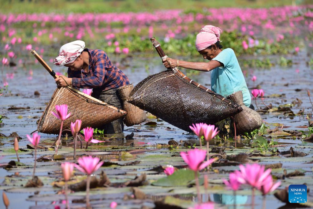 Women catch fish amid blooming water lily flowers in a lake at a village in Morigaon district of India's northeastern state of Assam, Nov. 6, 2022. (Str/Xinhua)