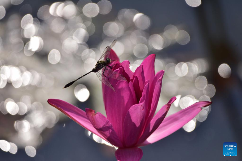A dragonfly rests on a water lily flower in a lake at a village in Morigaon district of India's northeastern state of Assam, Nov. 6, 2022. (Str/Xinhua)