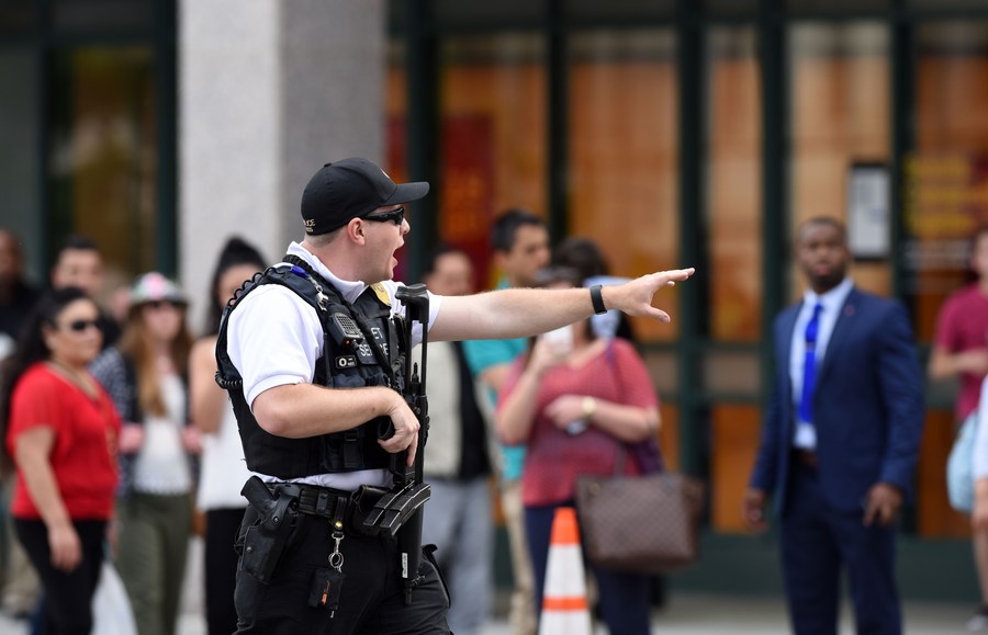 A Secret Service agent disperses pedestrians after a man brandishing a weapon outside the White House grounds was shot down in Washington, D.C., the United States, May 20, 2016. (Xinhua/Yin Bogu)