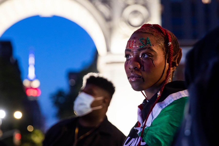 A woman with Tulsa displayed on her forehead attends an event in remembrance of the 100th year anniversary of the 1921 Tulsa Race Massacre, in New York, United States, May 31, 2021. (Xinhua/Michael Nagle)