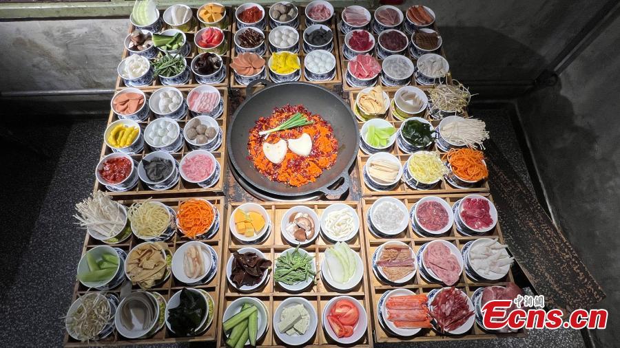 Various dishes are served in traditional Chinese porcelain Gaiwan at a hotpot restaurant, attracting customers in Chongqing, Nov. 7, 2022. (Photo: China News Service/Xiao Jiangchuan)