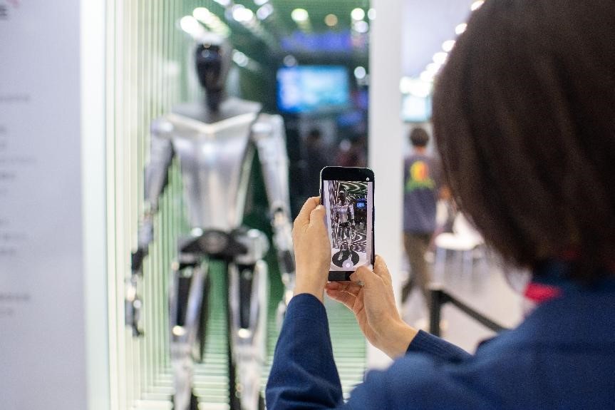 A visitor takes photos of a humanoid robot developed by Tesla at the automobile exhibition section of the fifth China International Import Expo, Nov. 5, 2022. (People's Daily Online/Weng Qiyu)
