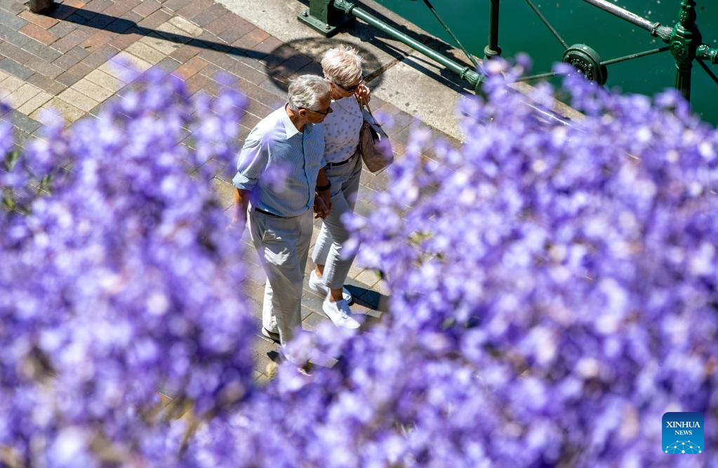 People walk under jacaranda blooms in Sydney, Australia, on Nov. 7, 2022. (Xinhua/Bai Xuefei)