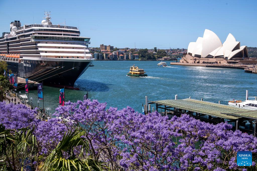 This photo taken on Nov. 7, 2022 shows jacaranda blooms near Sydney Opera House in Sydney, Australia. (Xinhua/Bai Xuefei)