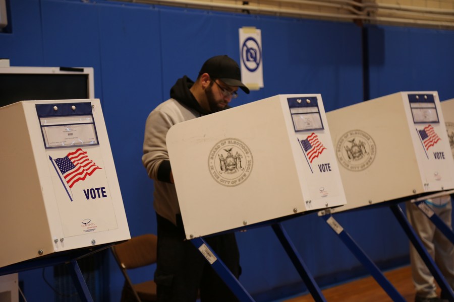 A voter fills in his ballot at a polling station in New York, the United States, on Nov. 8, 2022. (Xinhua/Liu Yanan)