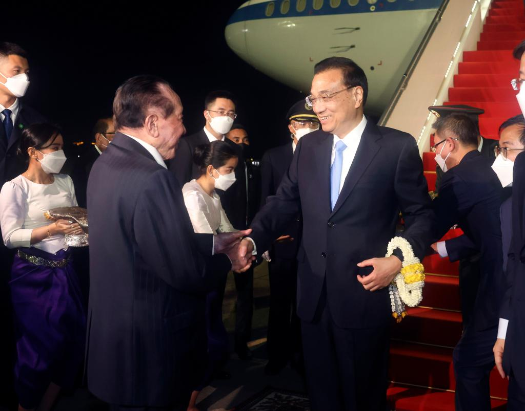 Chinese Premier Li Keqiang arrives at the Phnom Penh International Airport in Phnom Penh, Cambodia on Nov. 8, 2022. At the invitation of Prime Minister Samdech Techo Hun Sen of the Kingdom of Cambodia, Chinese Premier Li Keqiang arrived here Tuesday evening for a series of leaders' meetings on East Asia cooperation and an official visit to Cambodia. (Xinhua/Liu Weibing)