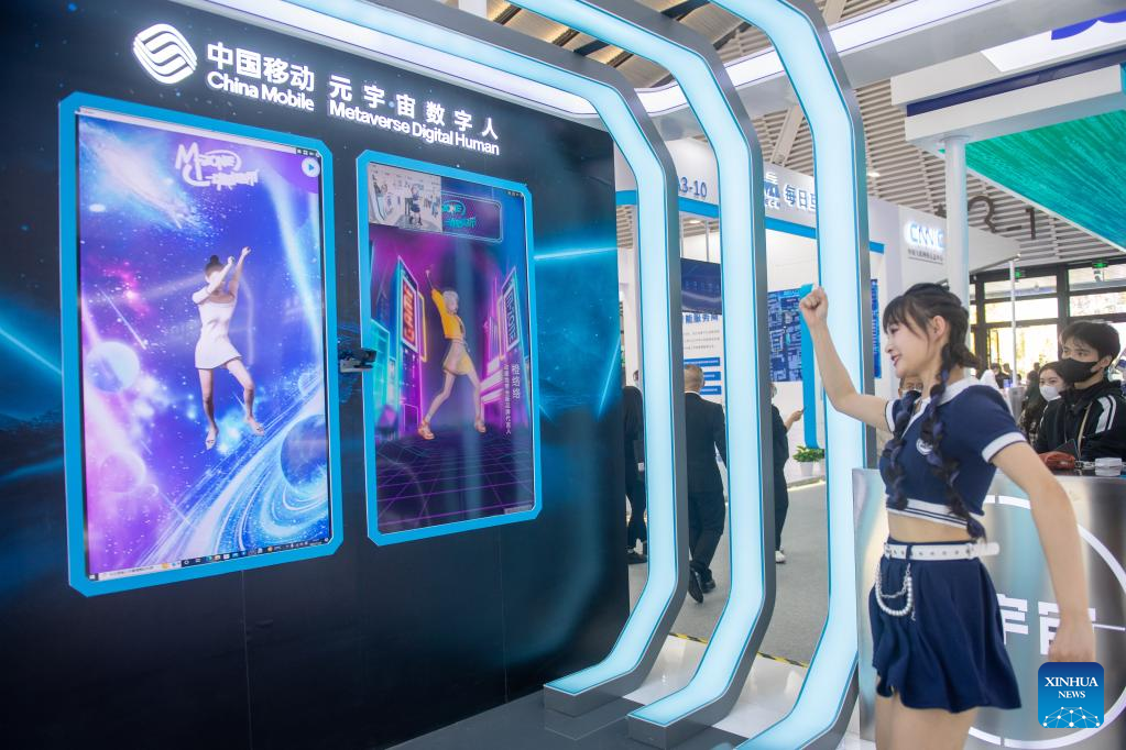 A woman plays an interactive dance game at the booth of China Mobile during the Light of Internet Expo in Wuzhen, east China's Zhejiang Province, Nov. 8, 2022. The expo kicked off here on Tuesday. (Xinhua/Jiang Han)