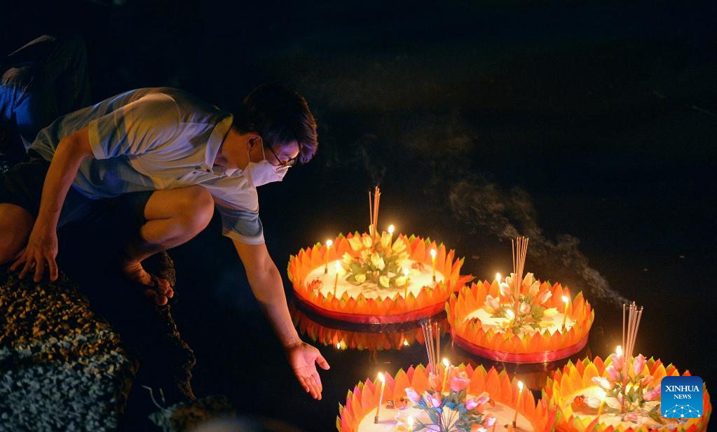 A man releases a water lantern in Bandar Seri Begawan, Brunei, on Nov. 8, 2022. The Thailand's traditional Loy Krathong Festival falls on Tuesday this year. Over 100 people including some Thai people living in Brunei released water lanterns for peace and luck. (Photo by Jeffrey Wong/Xinhua)