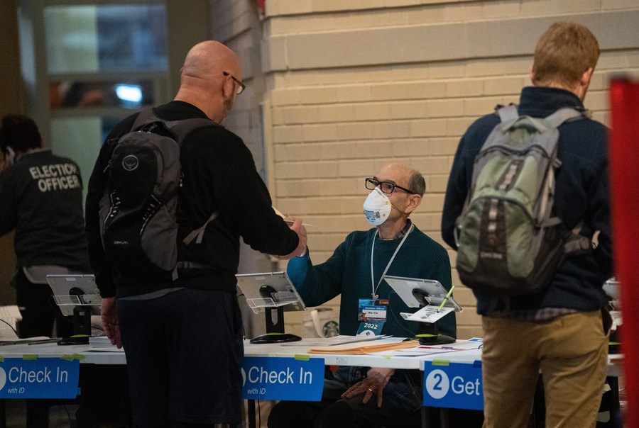 Voters check in during the U.S. midterm elections at a polling station in Arlington, Virginia, the United States, Nov. 8, 2022. (Xinhua/Liu Jie)