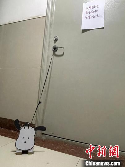 Photo shows a "dog" made of cardboard is "tied" at a doorway. (Photo/Fan Xinran)
