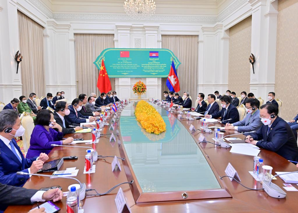 Chinese Premier Li Keqiang holds a meeting with Cambodian Prime Minister Samdech Techo Hun Sen at the Peace Palace in Phnom Penh, Cambodia, Nov. 9, 2022. (Xinhua/Yue Yuewei)