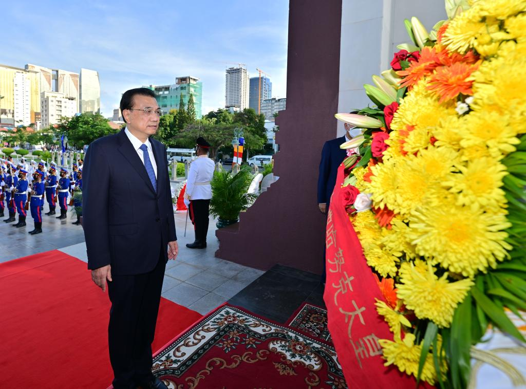 On Wednesday afternoon, Li laid wreathes at the Independence Monument of Cambodia and the Statue of King Father Norodom Sihanouk.