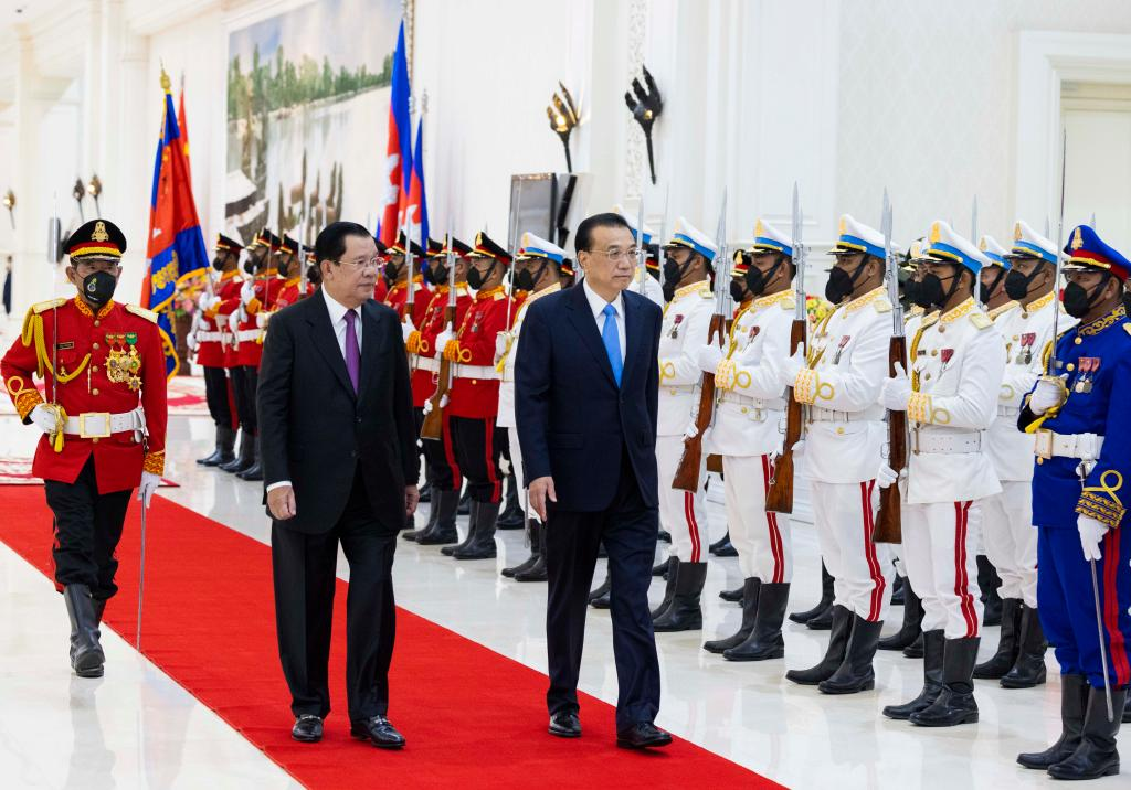 Prior to the meeting, Hun Sen held a grand welcome ceremony for Li at the Peace Palace. After they stepped onto the review stand, the military band played the national anthems of the two countries. Accompanied by Hun Sen, Li then reviewed the guard of honor.