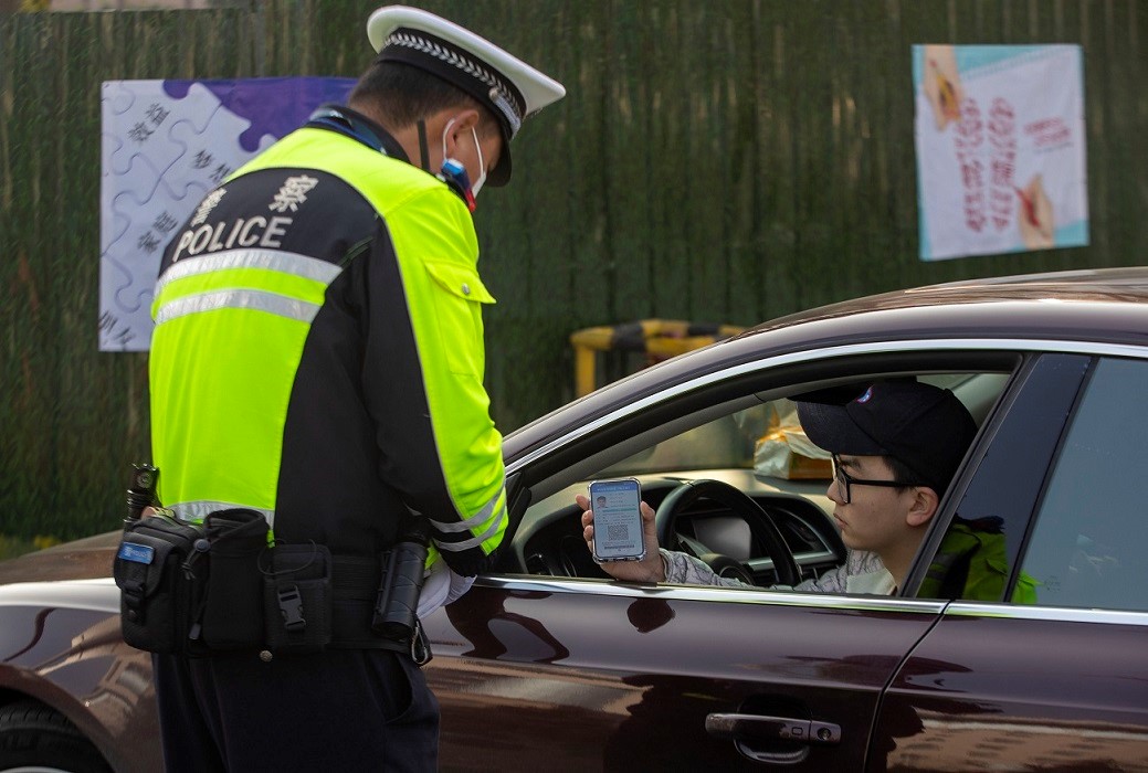 A man shows his digital driver's license to a traffic police officer in Taizhou, east China's Jiangsu province, December, 2021. (People's Daily Online/Tang Dehong)