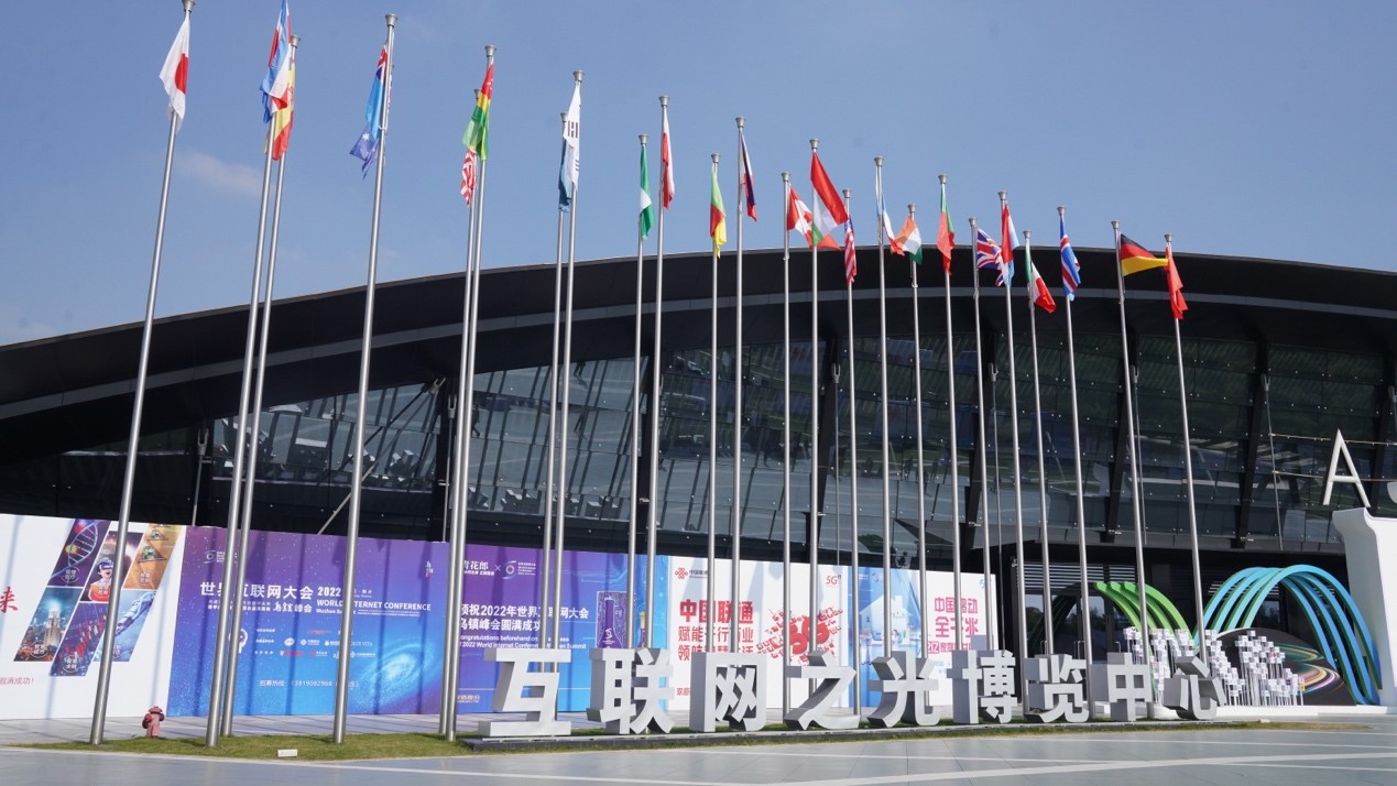 A photo taken on Nov. 8, 2022, shows the Light of Internet Expo venue in Wuzhen, east China's Zhejiang Province. The Light of Internet Expo opened on Nov. 8, 2022, a day before the opening ceremony of the WIC Wuzhen Summit. (People's Daily Online/Chen Luxun)