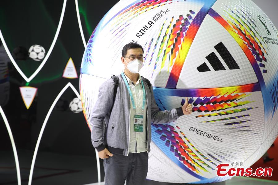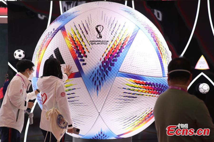 A jumbo-sized version of the official match ball of the FIFA World Cup Qatar 2022, with a diameter of 2.2 meters, is on display at the 5th CIIE in Shanghai, Nov. 9, 2022. Official match balls from the previous Would Cups are also exhibited at the 5th CIIE. (Photo: China News Service/Zhang Hengwei)