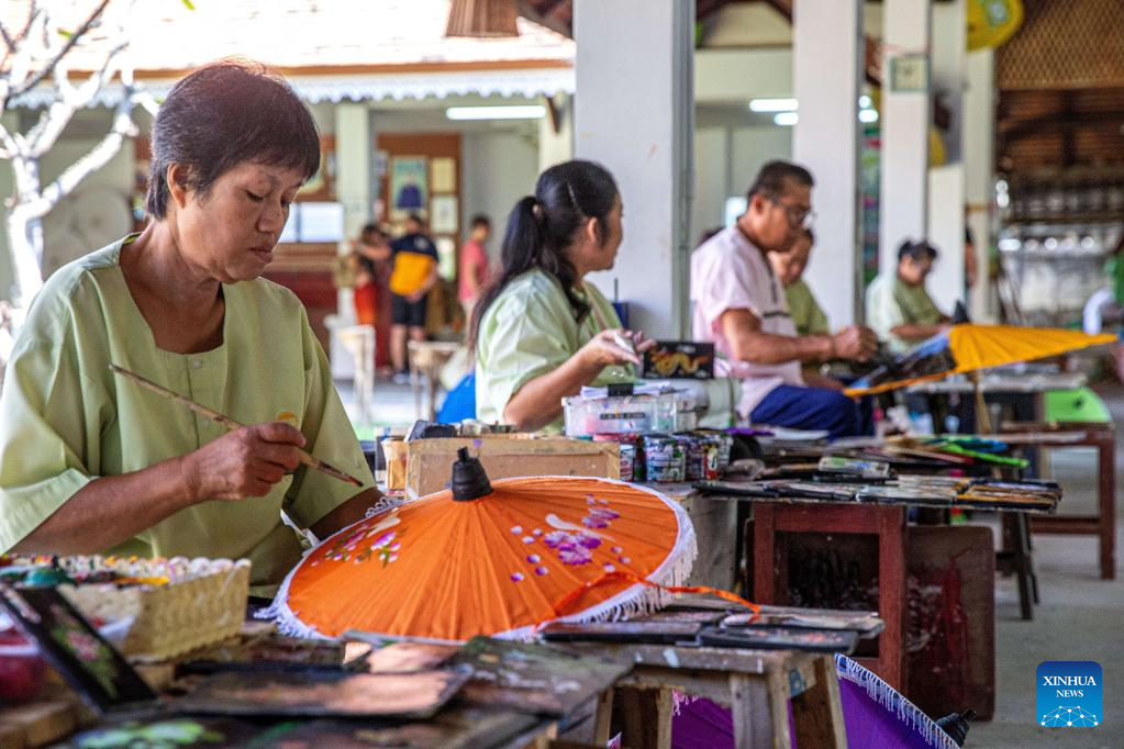 Artisans make paper umbrellas in Chiang Mai, Thailand, on Nov. 9, 2022. (Xinhua/Wang Teng)