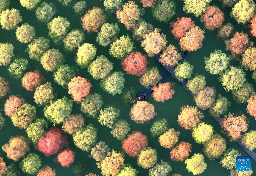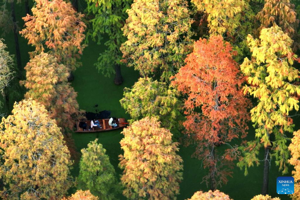 This aerial photo taken on Nov. 9, 2022 shows visitors taking a boat at a metasequoia forest in Luyang Lake wetland park in Yangzhou, east China's Jiangsu Province. (Photo by Meng Delong/Xinhua)