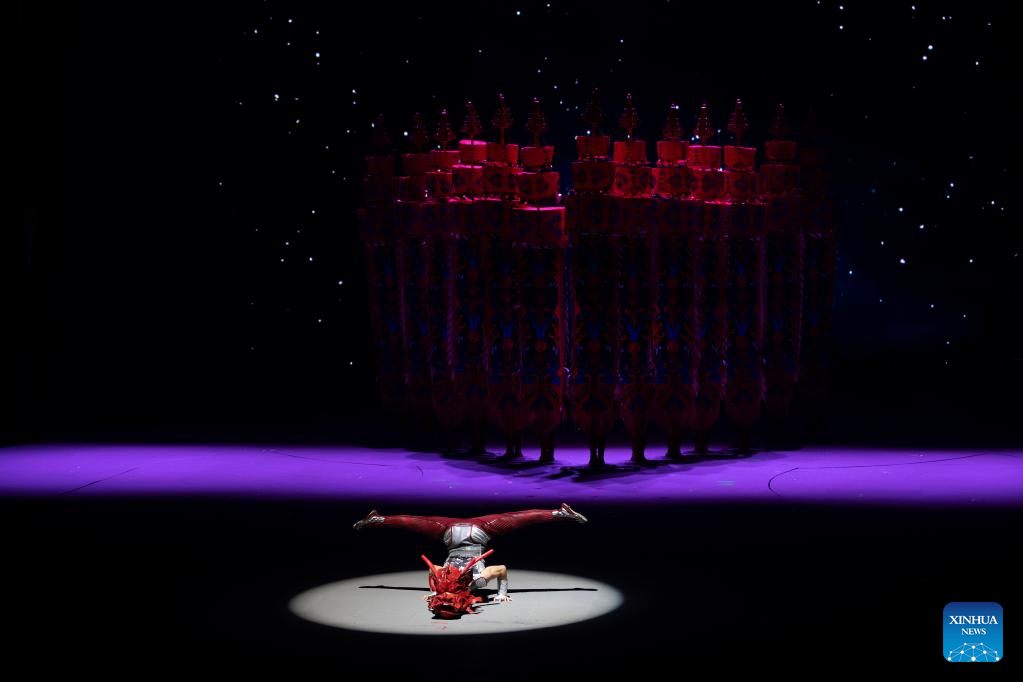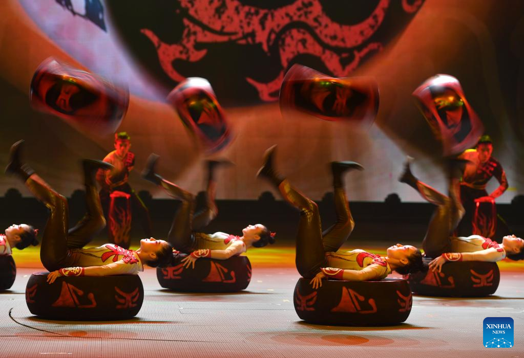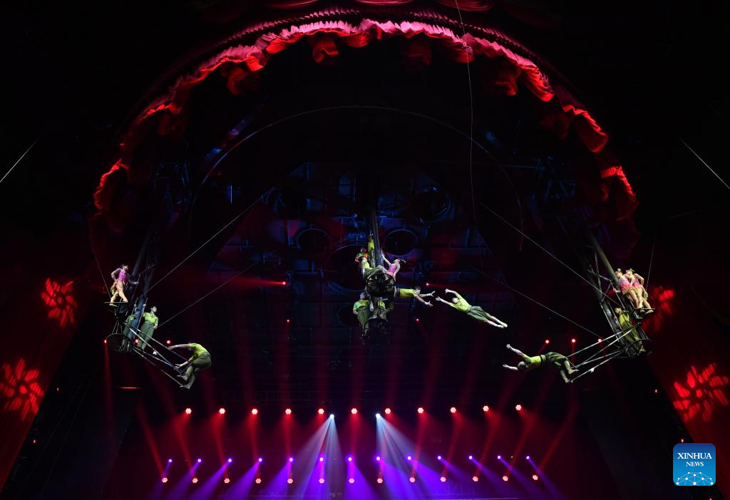 Artists perform during the 11th China Acrobatics Golden Chrysanthemum Awards Competition held in Puyang, central China's Henan Province, Nov. 9, 2022. This award is deemed the highest honor in China for acrobatics. (Xinhua/Li Jianan)
