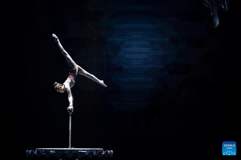 An artist performs during the 11th China Acrobatics Golden Chrysanthemum Awards Competition held in Puyang, central China's Henan Province, Nov. 9, 2022. This award is deemed the highest honor in China for acrobatics. (Xinhua/Xu Jiayi)