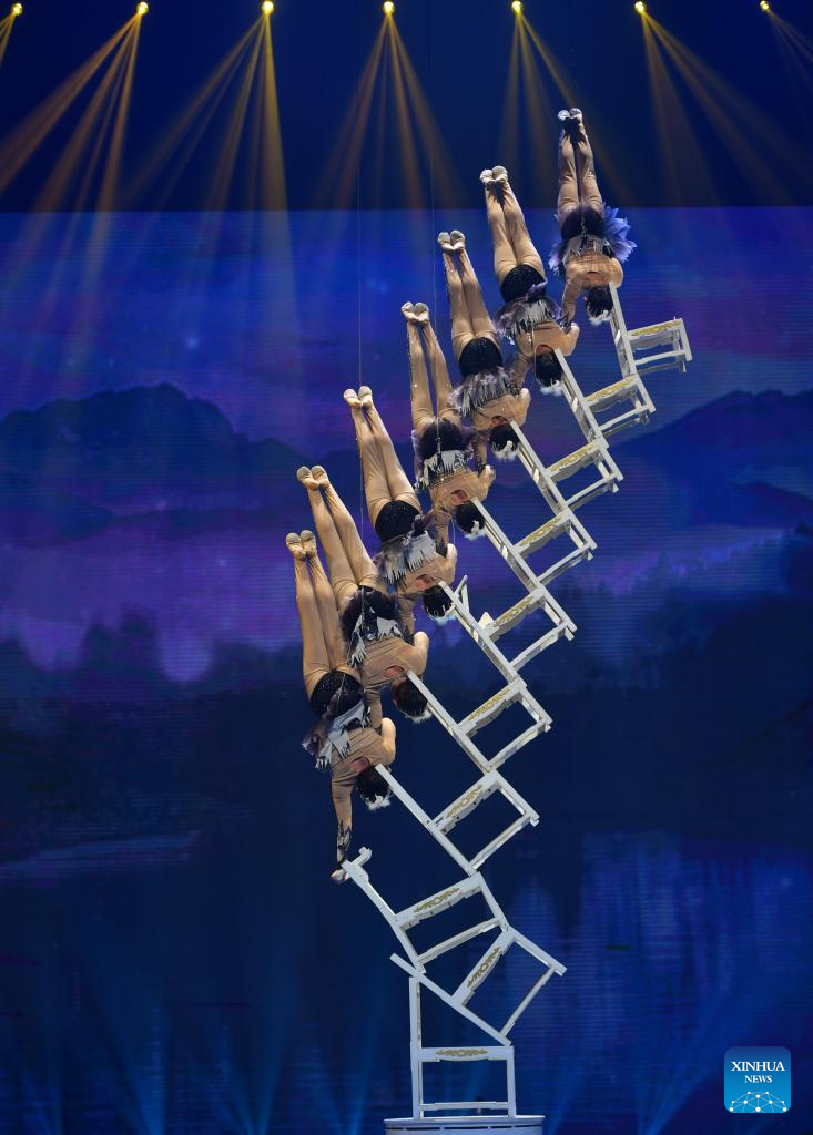 Artists perform during the 11th China Acrobatics Golden Chrysanthemum Awards Competition held in Puyang, central China's Henan Province, Nov. 10, 2022. This award is deemed the highest honor in China for acrobatics. (Xinhua/Li Jianan)
