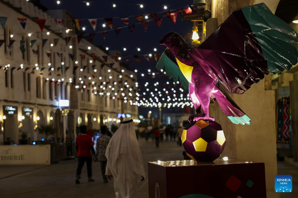 Pedestrians walk at the Souq Waqif with FIFA World Cup Qatar 2022 decorations in Doha, Qatar, on Nov. 9, 2022. (Xinhua/Li Ming)