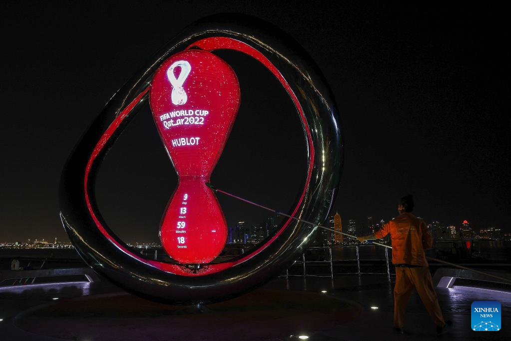 A staff member cleans the FIFA World Cup 2022 countdown clock near the Doha Corniche in Doha, Qatar, on Nov. 11, 2022. (Xinhua/Xu Zijian)