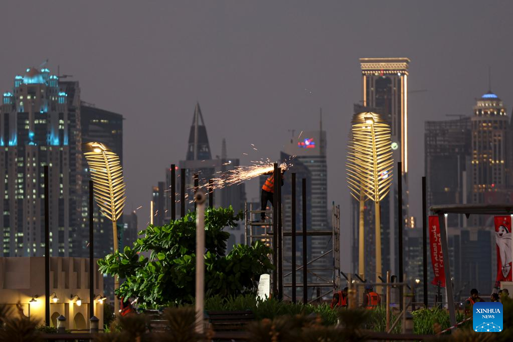 Workers work with FIFA World Cup Qatar 2022 installations at Doha Corniche in Doha, Qatar, on Nov. 8, 2022. (Xinhua/Li Ming)