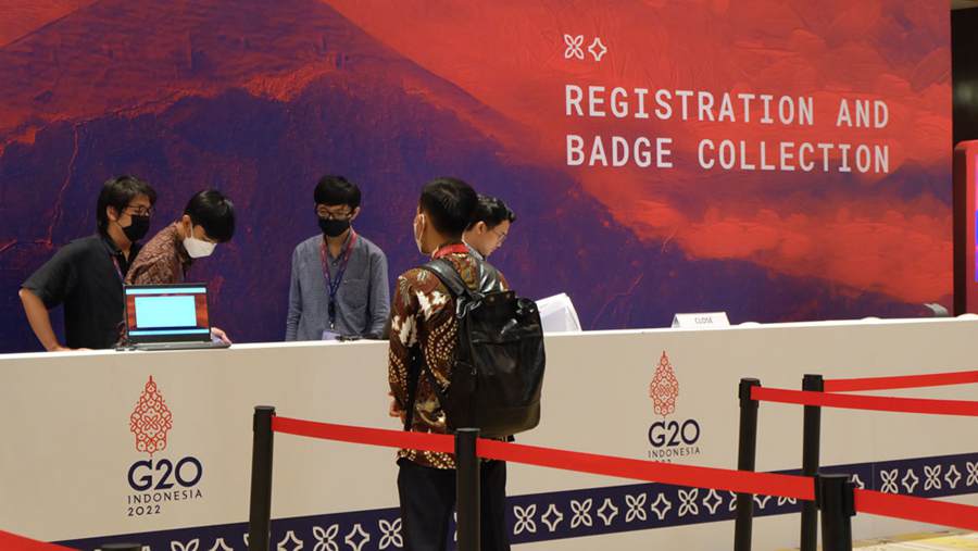 Photo taken on Nov. 13, 2022 shows staff members working for media registration for the upcoming 17th Group of 20 (G20) Summit in Bali, Indonesia. (People’s Daily Online/Zhong Wenxing)