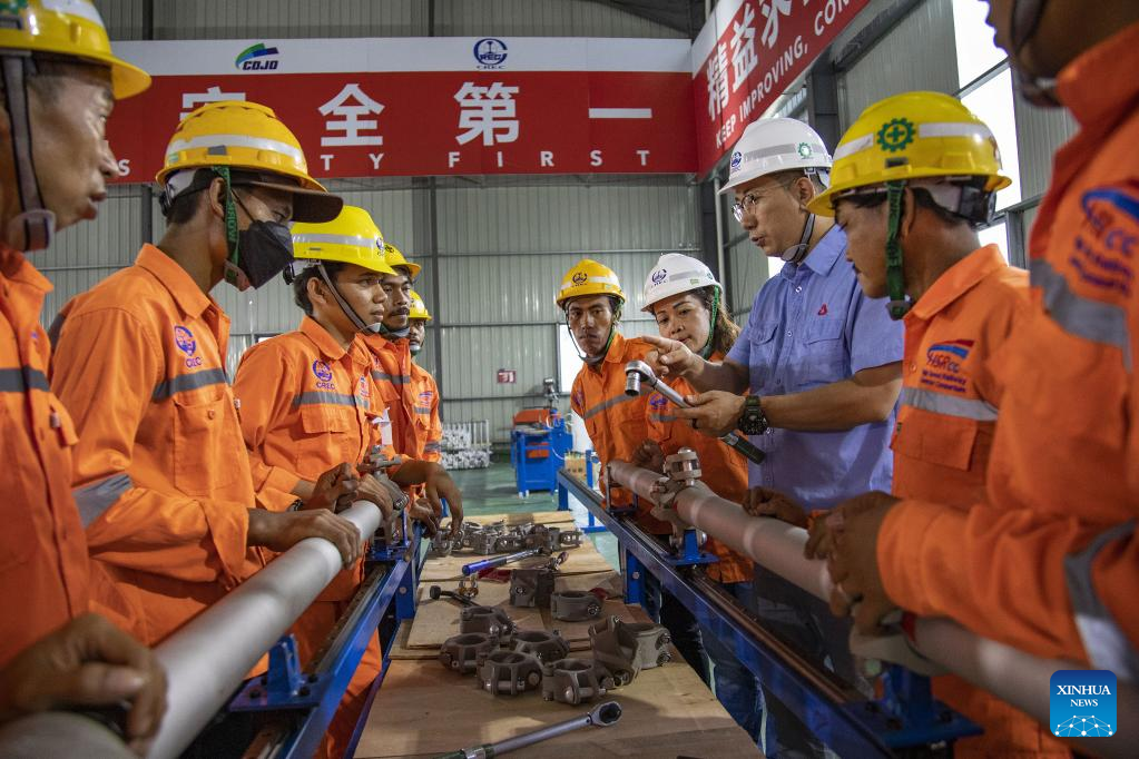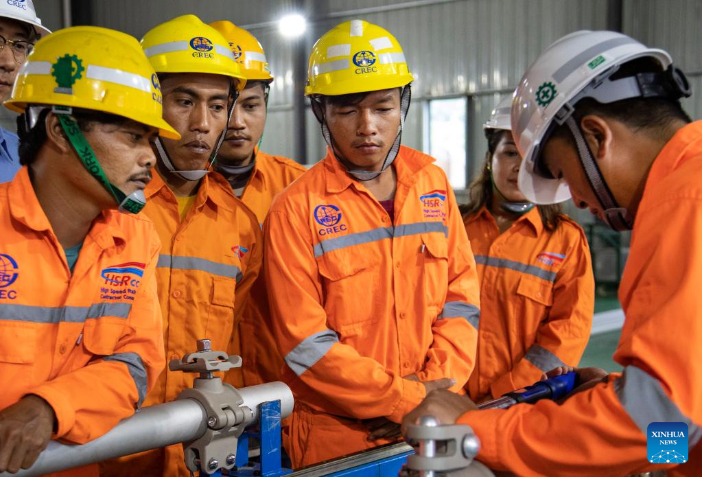 Indonesian technicians learn assembly skills from a Chinese instructor (3rd R) during a hand-on training session at the resource management center of the China Railway Electrification Engineering Group for the Jakarta-Bandung High-Speed Railway project in Bandung, Indonesia, Nov. 13, 2022. (Photo by Jiao Hongtao/Xinhua)