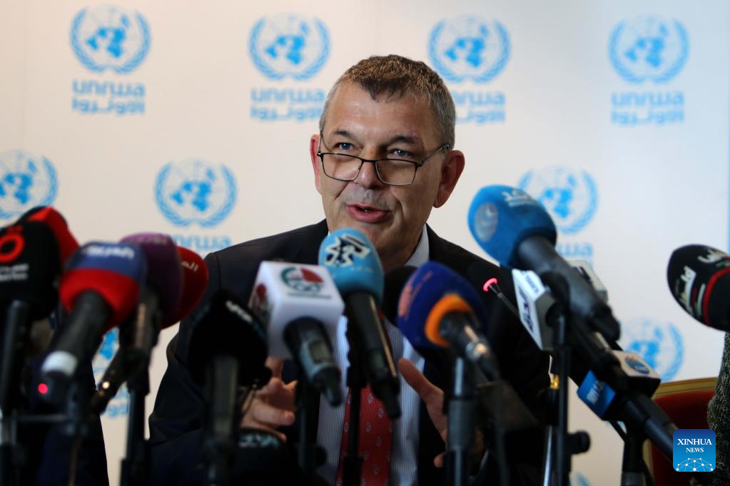 Commissioner-General of the United Nations Relief and Works Agency for Palestine Refugees (UNRWA) Philippe Lazzarini speaks at a press conference in Amman, Jordan, on Nov. 14, 2022. (Photo by Mohammad Abu Ghosh/Xinhua)