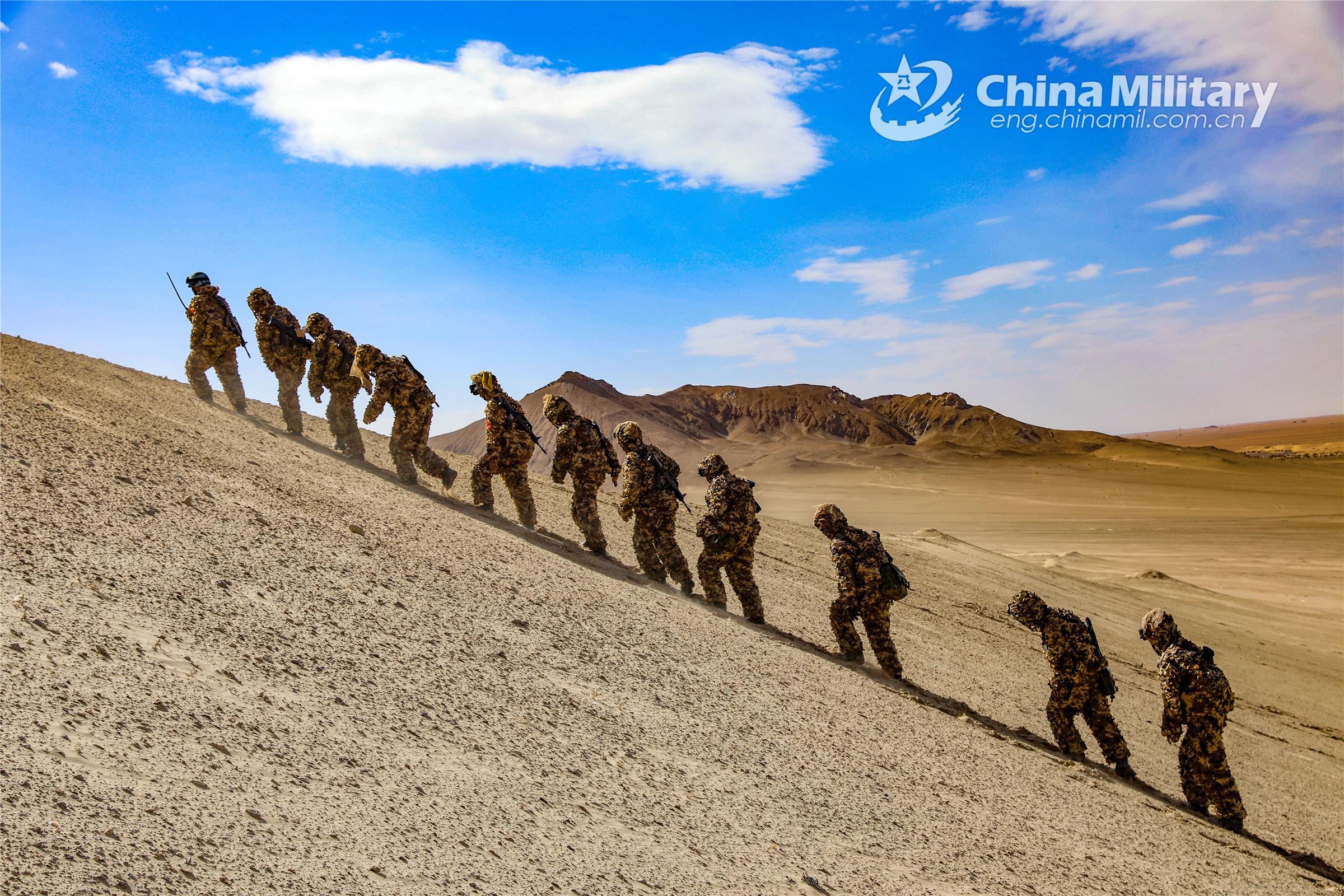 Members assigned to a reconnaissance element with an airborne brigade climb up a mountain slope during a tactical operation in unfamiliar terrain on October 14, 2022. (eng.chinamil.com.cn/Photo by Wang Bin)