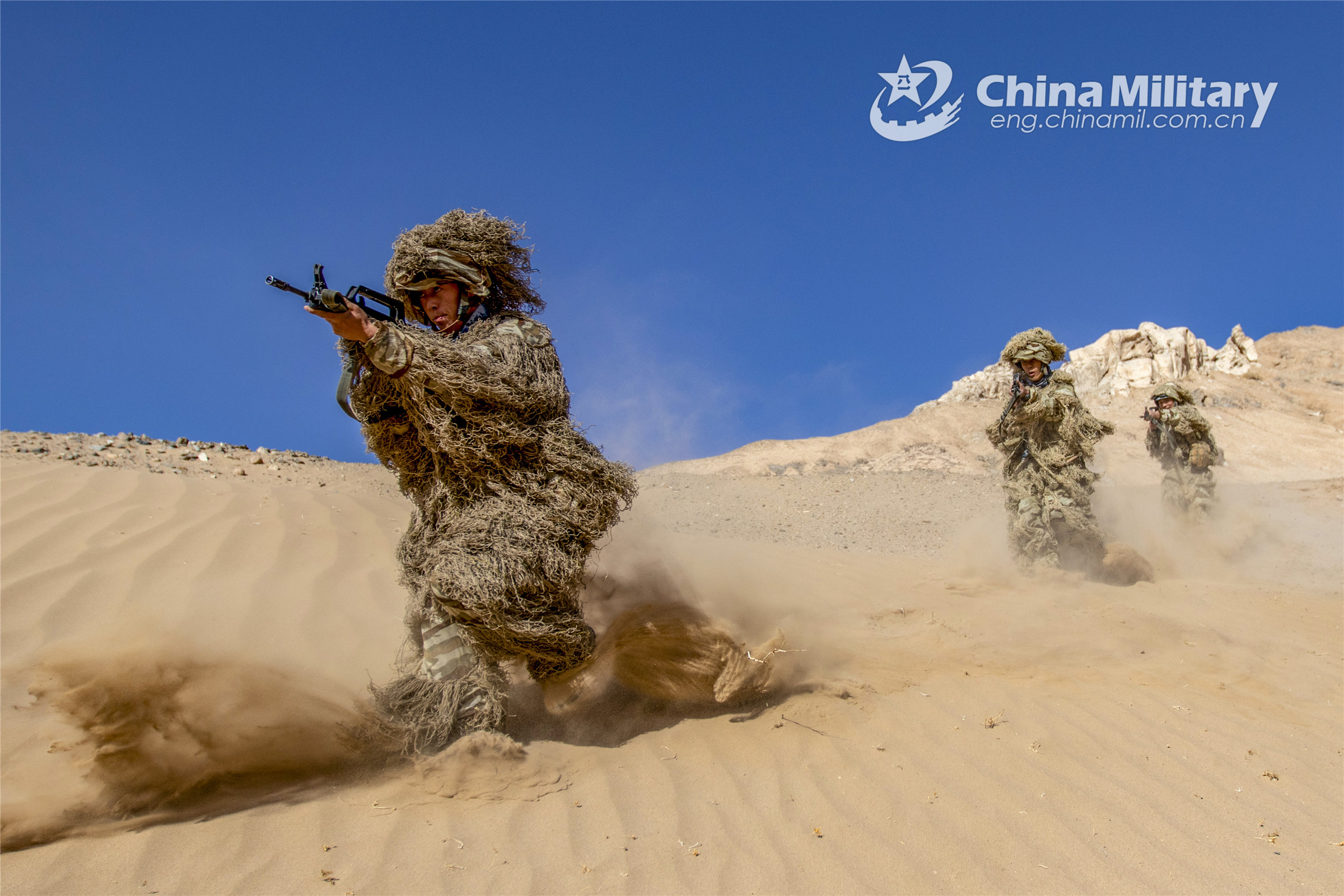 Members assigned to a reconnaissance element with an airborne brigade provide cover for each other in their ghillie suits during a tactical operation in unfamiliar terrain on October 14, 2022. (eng.chinamil.com.cn/Photo by Wang Bin)