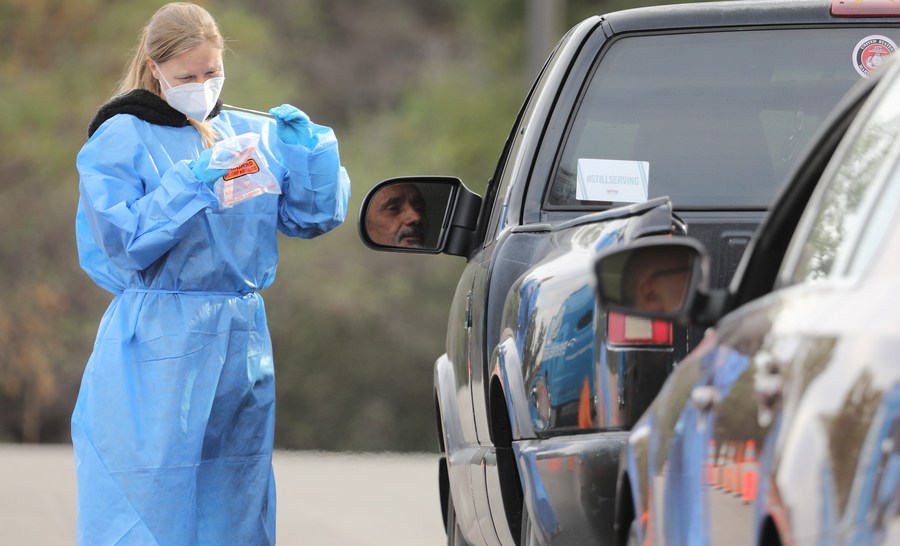 A medical worker collects a swab sample at a COVID-19 drive-through testing site in Los Angeles, California, the United States, Jan. 10, 2022. (Xinhua)