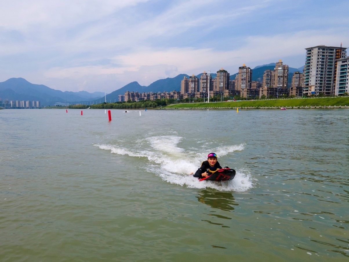 A woman tries jet surf at an open-day activity held by the Chinese national team of jet surf on the Nanming Lake in Lishui, east China's Zhejiang province. (Photo courtesy of the aquatic sports management center under the General Administration of Sport)