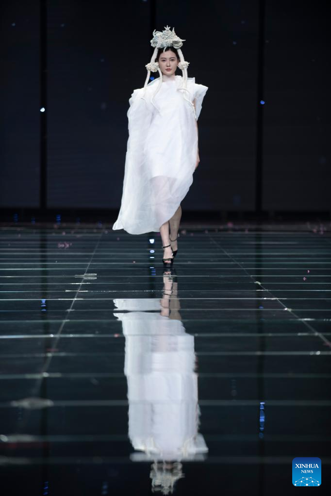 A model presents creations during the opening ceremony of an ethnic clothing festival held in Kunming, southwest China's Yunnan Province, Nov. 15, 2022. Creations from different ethnic groups of Yunnan will be presented during the ethnic clothing festival. (Xinhua/Chen Xinbo)