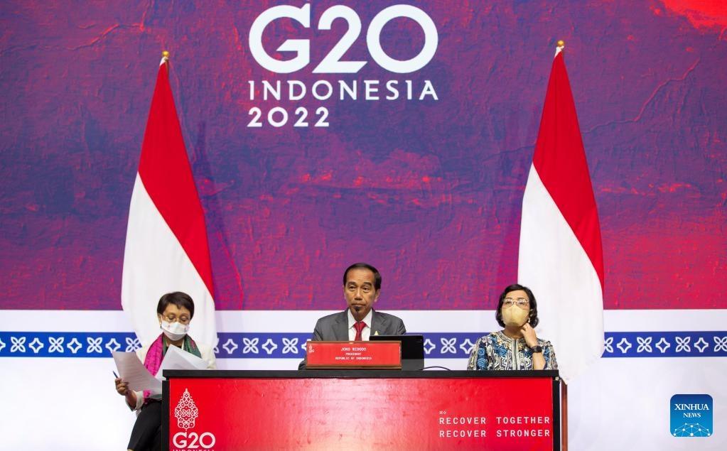 Indonesian President Joko Widodo (C) attends the closing press conference of the Group of 20 (G20) Summit in Bali, Indonesia, Nov. 16, 2022. The 17th G20 Summit concluded here on Wednesday. (Xinhua/Wang Yiliang)