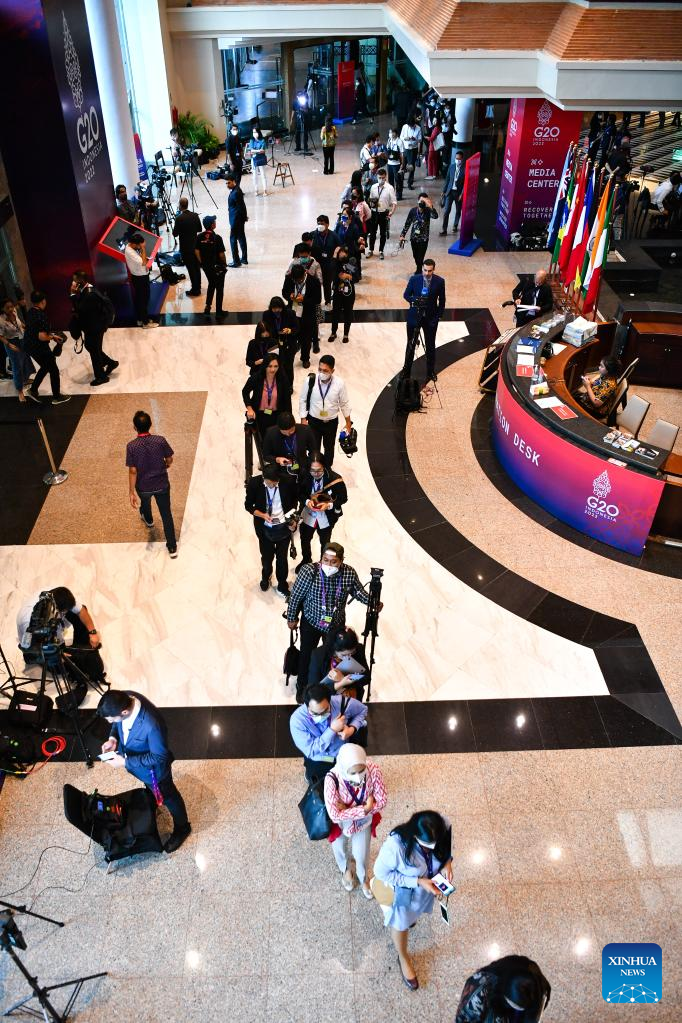 Journalists arrive for a press conference at the press center for the 17th Group of 20 (G20) Summit in Bali, Indonesia, Nov. 16, 2022. The 17th G20 Summit concluded here on Wednesday. (Xinhua/Xu Qin)