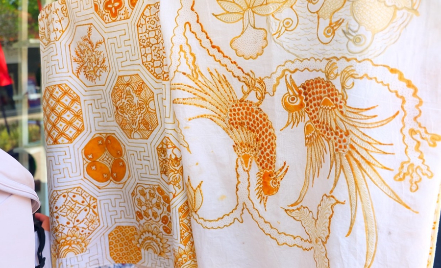 Batik is a textile that uses wax and dyes to create dots widely arranged in stunning patterns and designs. Chinese dragons, phoenixes and copper coins often feature in batik designs. Batik patterns, which are frequently seen on cloth or fabric, have also been incorporated into a variety of handicrafts, including clothing, purses, and coin bags.