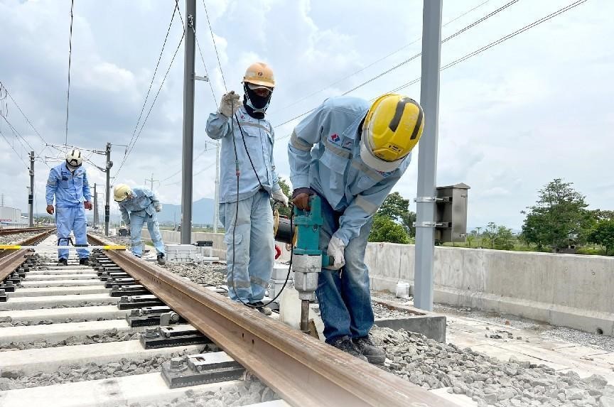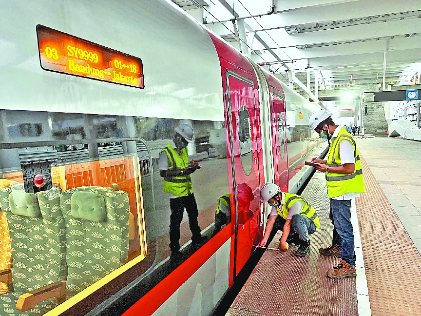 Technicians work at a train station along the Jakarta-Bandung High Speed Railway in Indonesia. (People's Daily/Li Qiang)