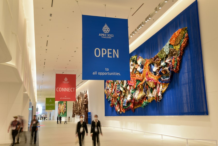 A logo of APEC 2022 is pictured in Bangkok, Thailand, Nov. 16, 2022. (Xinhua/Wang Teng)