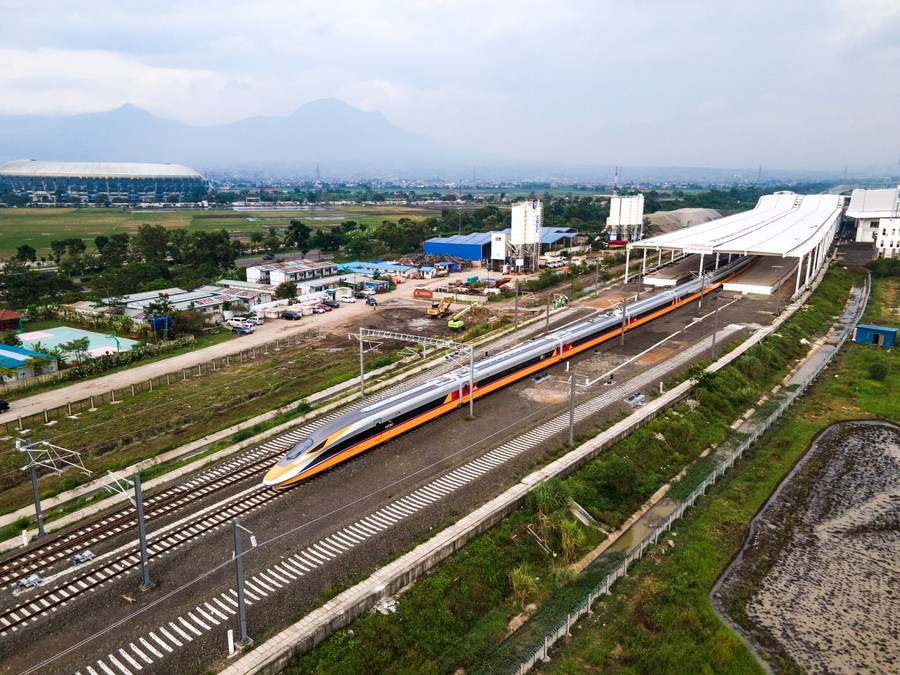 This aerial photo taken on Nov. 16, 2022 shows a comprehensive inspection train running on the Jakarta-Bandung High-Speed Railway trial section to conduct inspection in Bandung, Indonesia. (Photo by Jiao Hongtao/Xinhua)