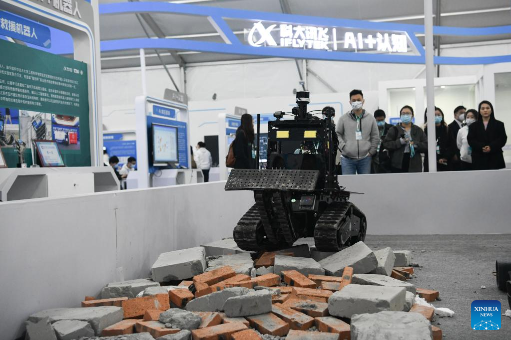 This photo taken on Nov. 17, 2022 shows a rescue robot exhibited at the 5th World Voice Expo in Hefei, east China's Anhui Province. (Xinhua/Zhang Duan)