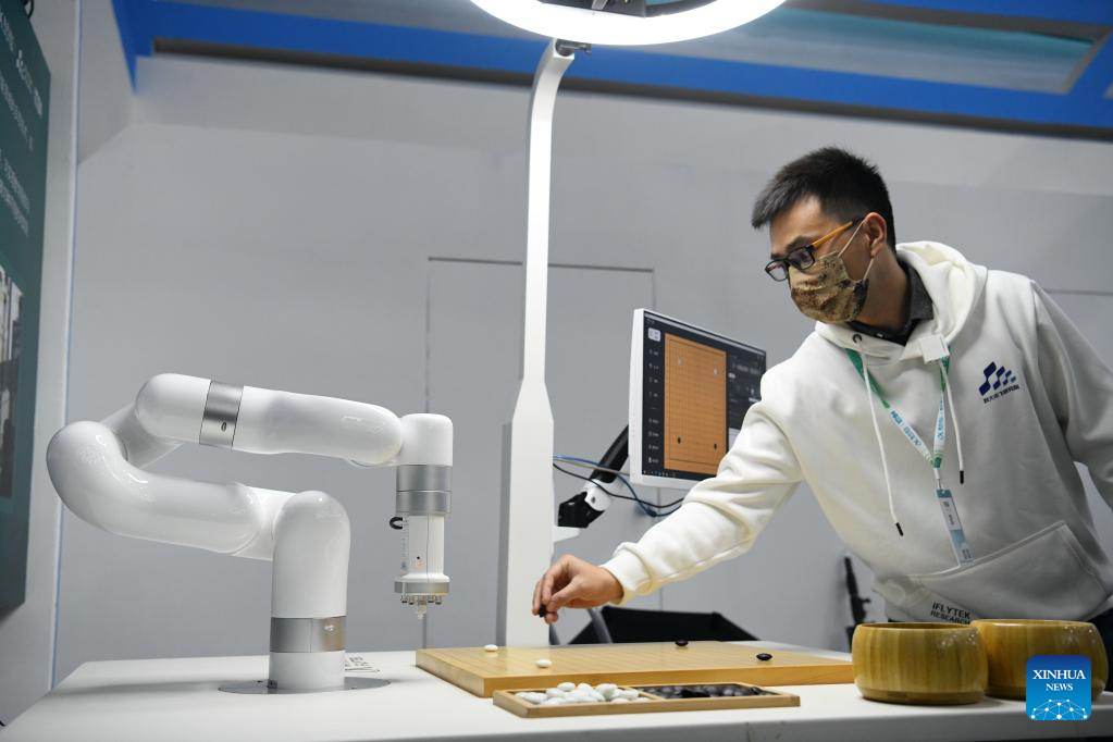 A staff member interacts with an intelligent robot applied to the teaching of Go game, known as Weiqi in Chinese, at the 5th World Voice Expo in Hefei, east China's Anhui Province, Nov. 17, 2022. (Xinhua/Zhang Duan)