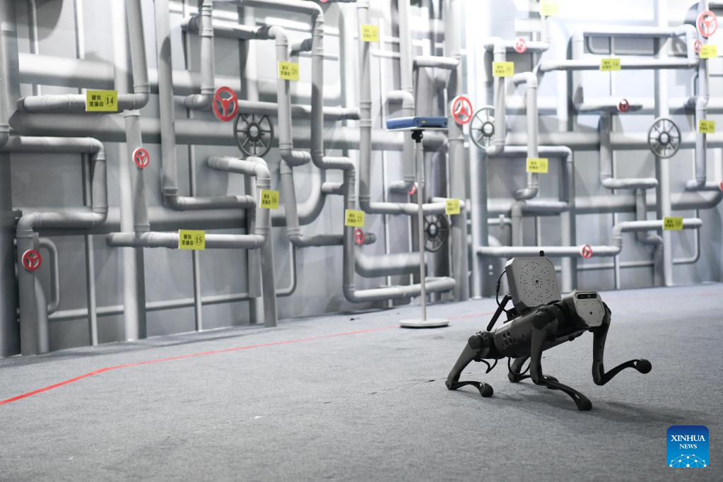 This photo taken on Nov. 17, 2022 shows a quadruped robot applied to industrial inspection at the 5th World Voice Expo in Hefei, east China's Anhui Province. (Xinhua/Zhang Duan)