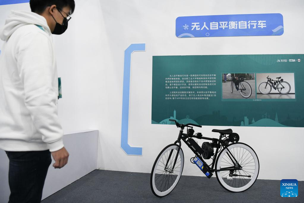 This photo taken on Nov. 17, 2022 shows a unmanned self-balancing bicycle exhibited at the 5th World Voice Expo in Hefei, east China's Anhui Province. (Xinhua/Zhang Duan)