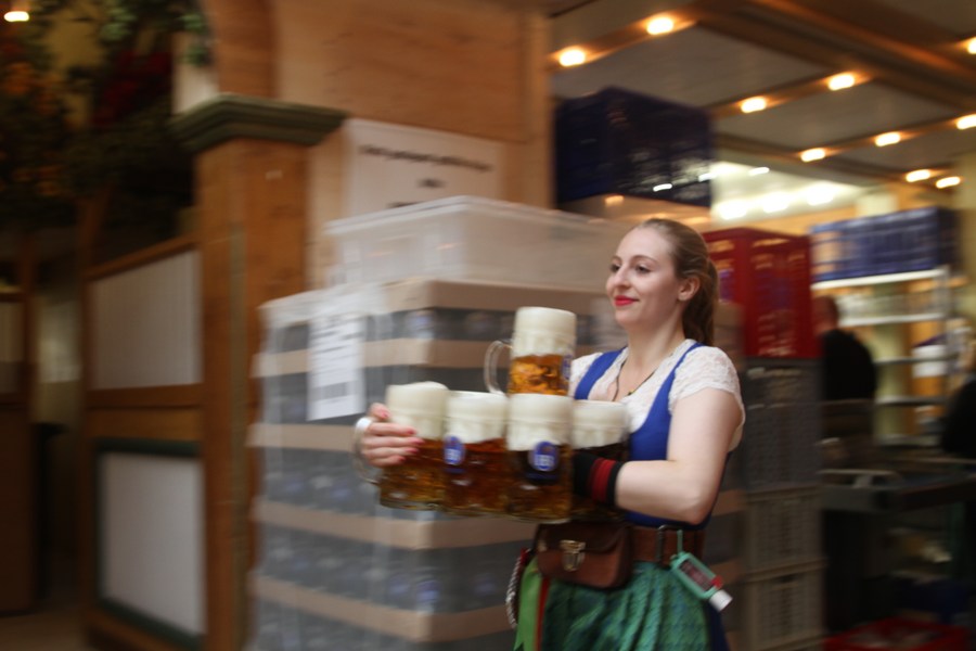 A staff member serves beer on the opening day of the Oktoberfest 2022 in Munich, Germany, Sept. 17, 2022. (Xinhua/Shan Weiyi)