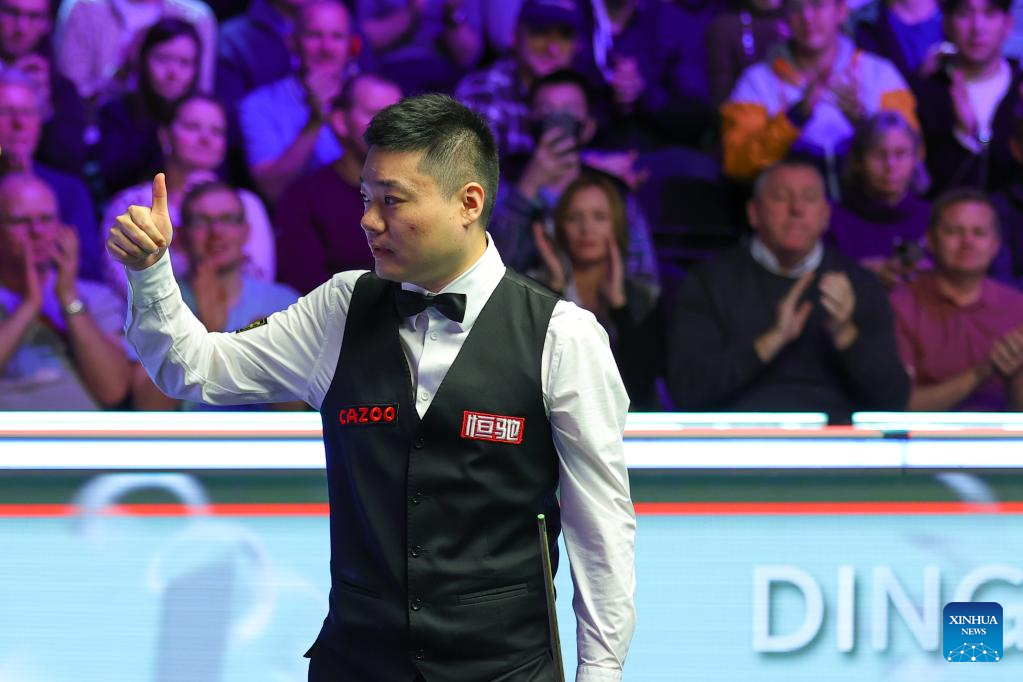 Ding Junhui of China celebrates after the second round match against Jamie Clarke of Wales at 2022 UK Snooker Championship in York, Britain, Nov. 17, 2022. (Photo by Zhai Zheng/Xinhua)