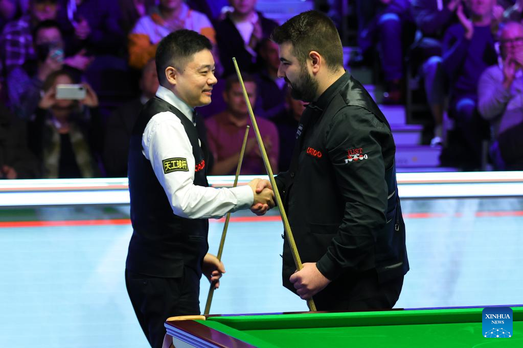 Ding Junhui (L) of China shakes hands with Jamie Clarke of Wales after the second round match at 2022 UK Snooker Championship in York, Britain, Nov. 17, 2022. (Photo by Zhai Zheng/Xinhua)